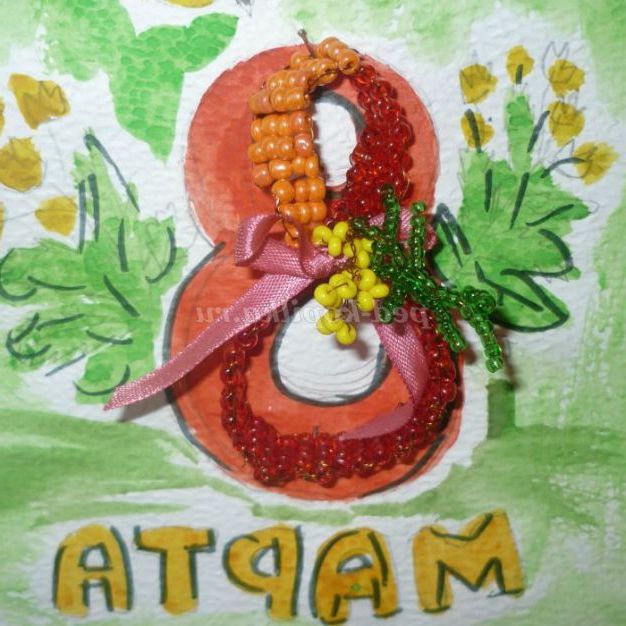 8 березня - свято, яке відзначають, коли весна тільки зароджується. Цей день, як пролісок , блискучою проталинке, що радує око і серце. Так давайте в цей день порадуємо своїх мам і бабусь подарунком виконаним своїми руками. Не тільки проліски радують нас з приходом весни, але й інші нітрохи не поступаються їм по красі весняні квіти. Поява в квіткових магазинах ніжною мімози завжди нагадує про те, що наближається свято і пора подбати про подарунки. Жовті грудочки цих квітів дуже схожі на жовті намистинки. Чи Не правда?!Звичайно сплетені нами гілочки будуть гарні самі по собі, але ми дамо їм святкової урочистості і поставимо в сплетену цифру «8».