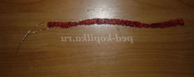 1.Отрезать дріт довжиною 1м.20см. Набрати 8 бісеринок червоного кольору, вирівняти кінці дроту, щоб бісеринки опинилися на її серединці.