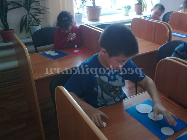 А зараз ми з вами зробимо аплікацію сніговика. Тільки такого, щоб відрізнявся від інших. Звичайно, ваші сніговики будуть схожі один на одного, адже кожен сніговик складається з ... чого? Скільки потрібно снігових куль для сніговика? Якого розміру ці кулі і як розташовані? Що може служити сніговикові головним убором? Які предмети одягу можна намалювати сніговикові? А що дати йому в руки? Який вираз обличчя може бути у сніговика?