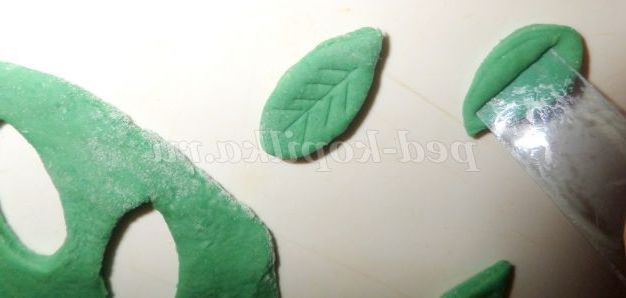 Розкачати тісто зеленого кольору і малою формою листка вирізати 3 листочка. Робимо прожилки лопаткою.