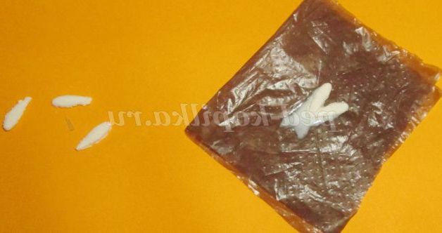 Починаємо збирати квітка. На шматочок плівки капаємо клей ПВА.