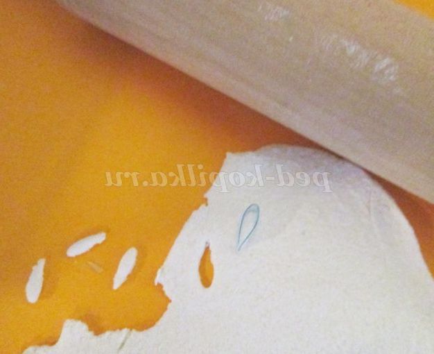 1. Розкачати тісто тонко білого кольору. Вирізаємо малою формою-листком 16 - 18 пелюстка.