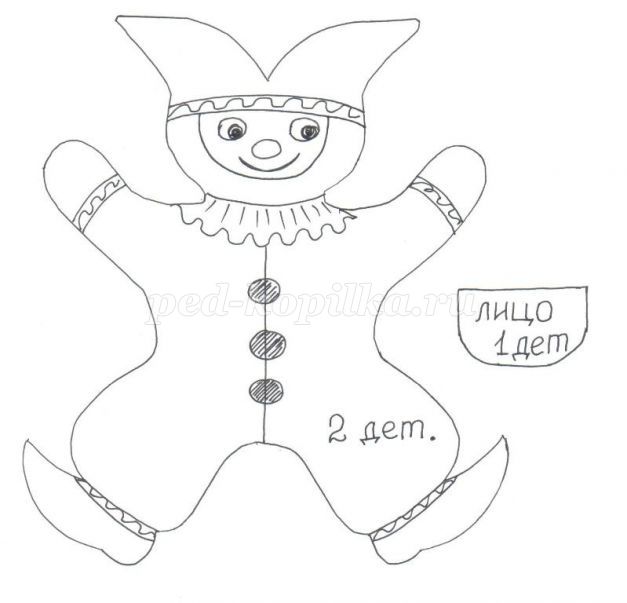 Крок 3. Розкладаємо деталі іграшки таким чином, щоб половинки іграшки були різних кольорів, як костюм Петрушки