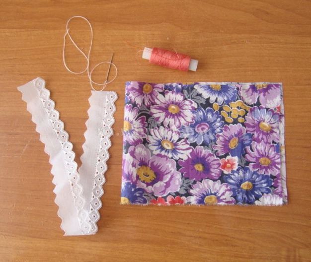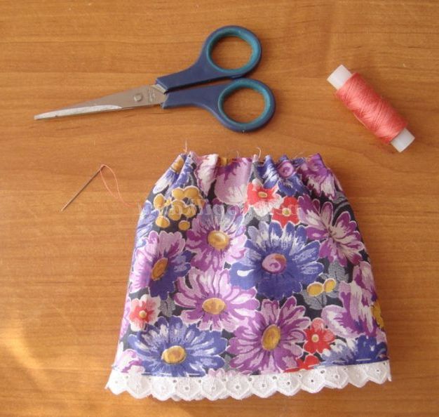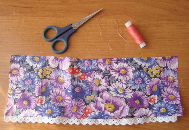 Крок 9. Для сарафана нам знадобиться яскравий шматок х/б тканини довжиною 40 см, висотою, в залежності від висоти ляльки (основи - пляшечки) від 12 див., шиття або тасьма довжиною 40 див.