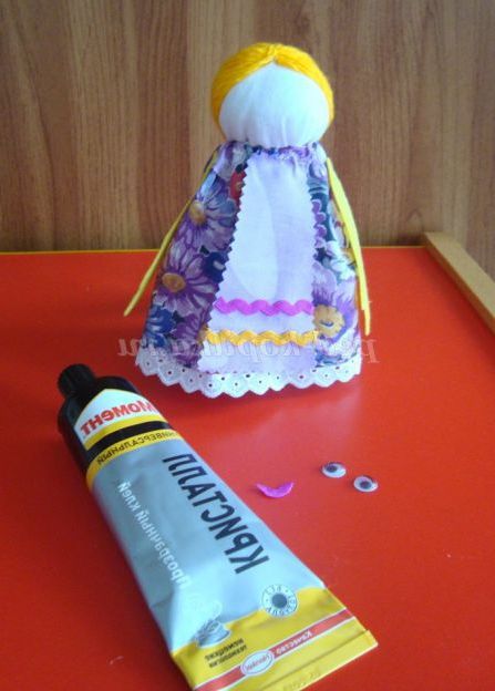 Крок 18. Оформляємо особа: приклеюємо очі й рот ляльки.