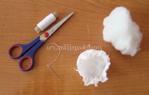 Крок 4. Стягаємо коло, але не повністю так, щоб його можна було закріпити на горлечко пляшки-основи, набиваємо голову ляльки синтепоном, виходить кулька - голова ляльки.