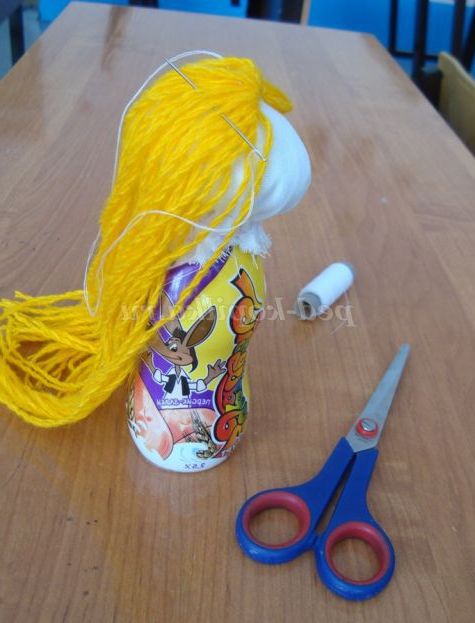 Крок 5. Голову ляльки закріплюємо на основу: одягаємо на горлечко пляшки, стягаємо щільно нитка, робимо по колу кілька стібків, щоб голова щільніше прилягала до основи.