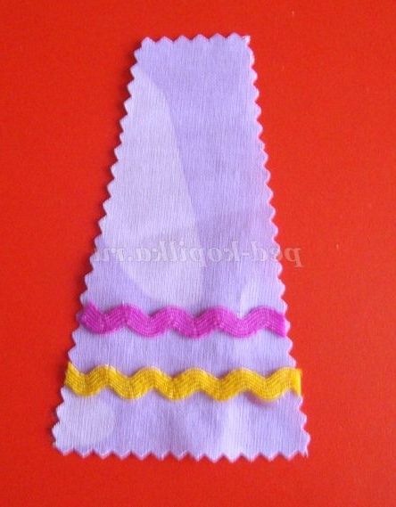 Крок 14. З х/б тканини вирізаємо фартух для ляльки у формі трапеції, готуємо тасьму для обробки, приклеюємо тасьму.