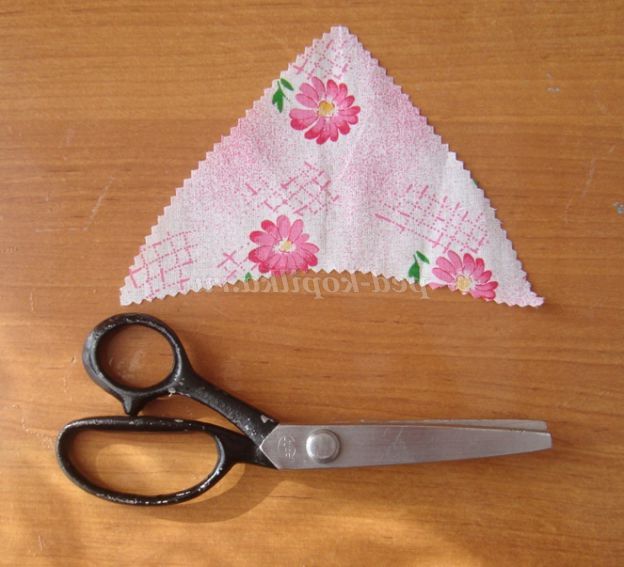Крок 19. Вирізаємо з х/б тканини фігурними ножицями хустинку для ляльки у формі трикутника (підстава - 25 див).