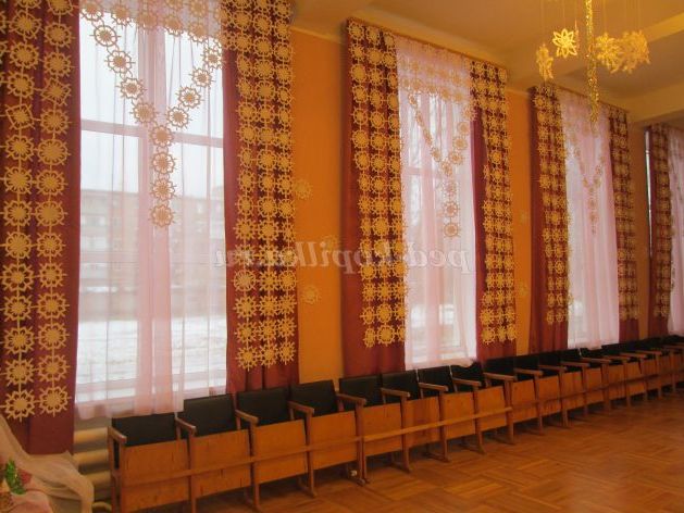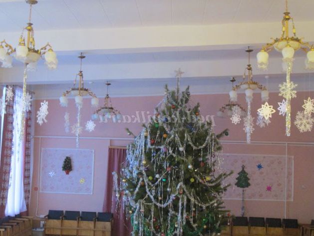 Люстри старалися прикрасити так, щоб при вході до актової зали, відвідувачі звертали свою увагу на ажурні, повітряні шторы.И у теж час, необхідно було витримати один стиль оформления.Вариантов було багато, але вирішили зупинитися на цьому. Сніжинки і дощик завжди надають святкове, зимовий, чарівний настрій.