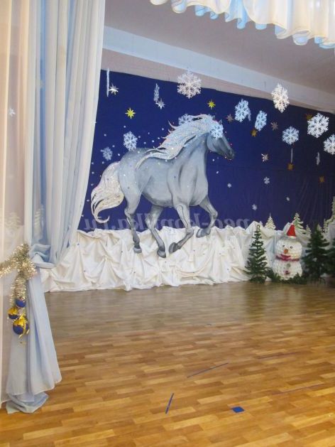 В цьому році нашим прикрасою залу захоплювалися всі. І батьки, і учні, і гості говорили нам слова вдячності за таке казкове оформлення. Усіх захоплювали мереживні штори і конячка, мчащаяся вперед. Я теж була задоволена виконаною роботою.