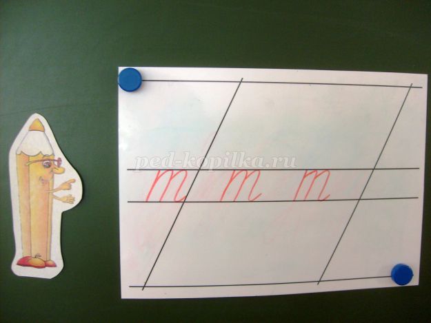 - Зверніть увагу, що лінія нахилена вправо сильніше. Вгорі заокруглюємо, торкаючись верхньої лінії, потім нахил з закругленням внизу, торкаючись нижньої лінії.