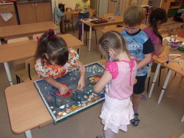 Вихователь. Спочатку обговоріть, будь мешканців підводного світу ви б хотіли зобразити на своїй композиції. Вислухайте кожного за своїм робочим столом. Потім обговоріть, якою буде загальна композиція: яке зображення ви помістіть в центрі? Може це буде золота рибка з пишним хвостом, або рибка - клоун, або морська зірка. Я думаю, ви пам'ятаєте, що яскраві, барвисті зображення можна отримати у вигляді мозаїки, виконаної методом обривання. Але щоб справитися з цією роботою, знадобиться участь всіх.