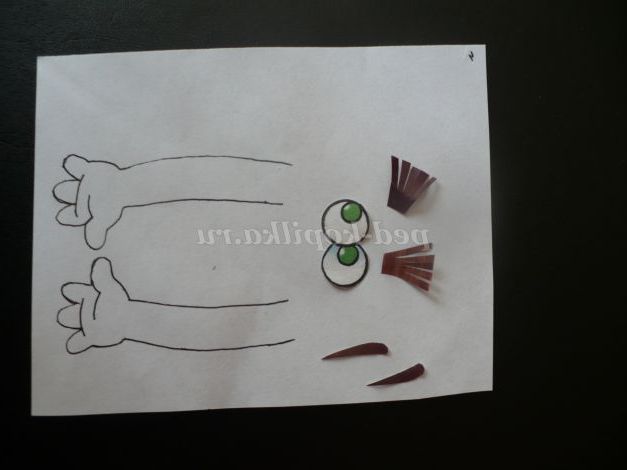 2. Робимо особа: Всі деталі приклеюємо на двосторонній скотч. Малюємо на папері очі, вирізаємо і приклеюємо на яйце. Вирізаємо з коричневою кольорового паперу вії і брови, приклеюємо над очима. Під очима малюємо ніс чорною гелевою ручкою. З рожевої кольорового паперу вирізаємо губки, приклеюємо на яйце.