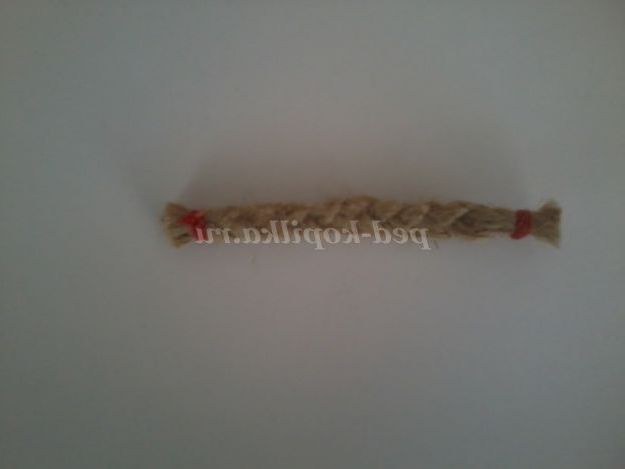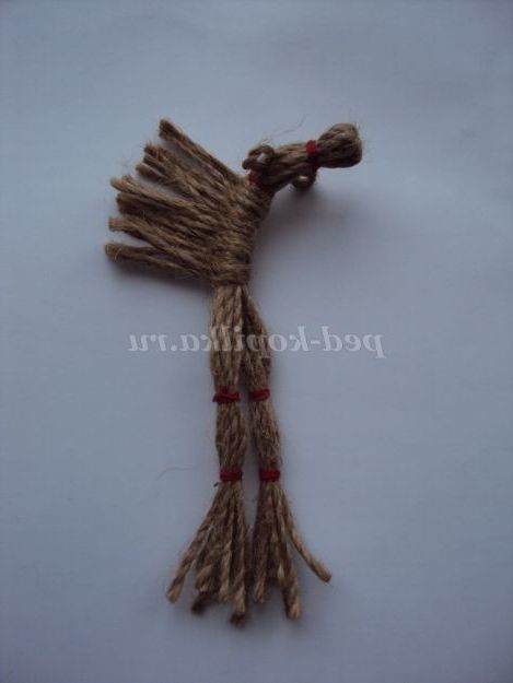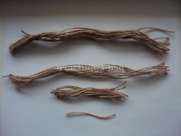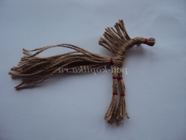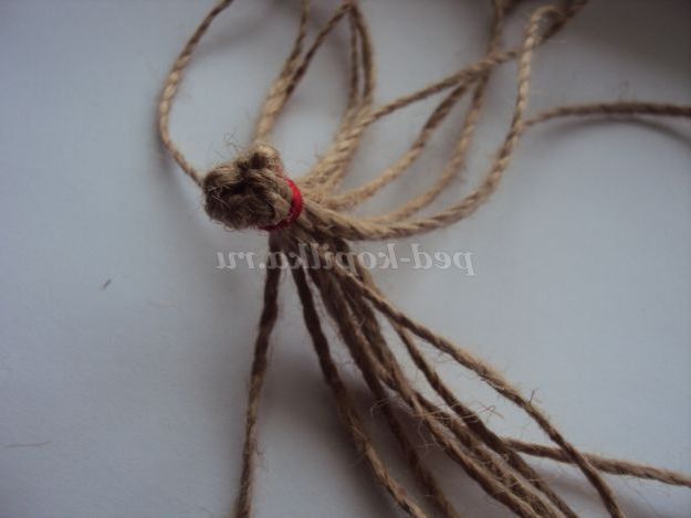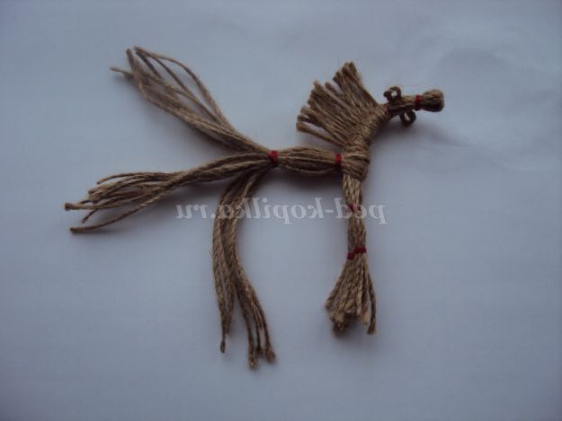 14. Беремо смужки джутового шпагату по 10 див. 8 штук, перев'язуємо з двох сторін і відрізаємо зайве - це передні копита.