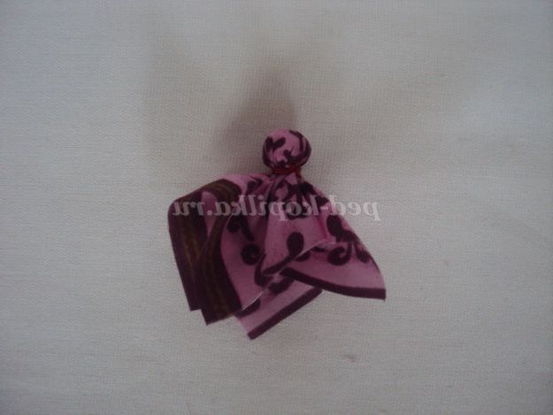 3. Одну половину розділити на дві частини, з'єднати з другою половиною і перев'язати червоною ниткою «ірис» щоб вийшла морда конячки.