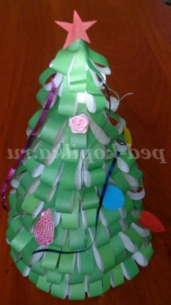 9. Наша ялинка готова, залишилося її нарядити. З кольорового паперу, фольги, яскравих барвистих журналів, фантиків вирізаємо і наклеюємо ялинкові іграшки. Верхівку ялинки прикрашаємо червоною зірочкою. Приклеюємо дощик, мішуру.