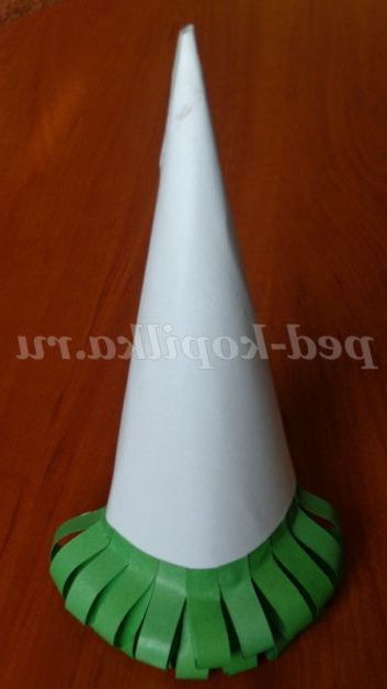 6. Знизу по краю конуса приклейте клеєм ПВА по одній заготовці-голочці, нижній край голочки повинен бути при приклеюванні на одному рівні з нижнім краєм конуса. Лінія приклеювання повинна бути рівною.