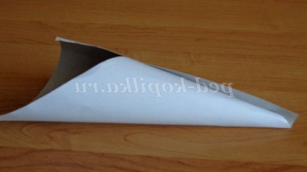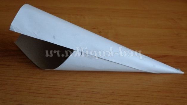 1. З аркуша білого картону прямокутної форми згорнути конус кулечком по спіралі, внизу шов прихопити степлером