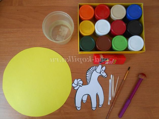 велике коло з кольорового картону (формат картону А4),шаблон дымковского коня,гуаш,тички,ватяні палички,зубочистки,баночка для води,пензлі,клей-олівець