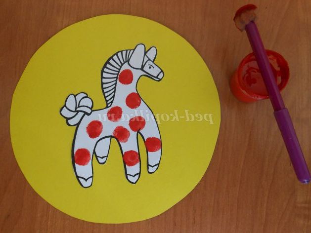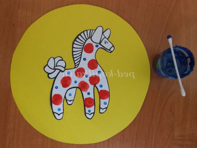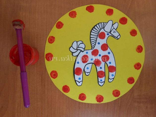 А тепер приступимо до прикраси тарілочки дымковскими візерунками. Спочатку поролоновим стусаном нанесемо по всій фігурки коня великі кружочки.Цвет можна вибрати будь-який з яскравою дымковской палітри, у мене це червоний.