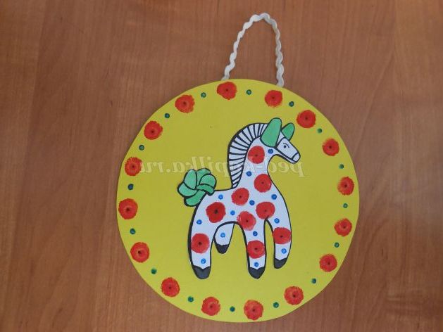А це наша готова декоративна тарілочка "Димковський кінь". Для того щоб її можна було використовувати для прикраси будинку, ми приклеїмо із зворотного боку тесемочку.