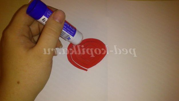 6.Раскрываем лист і змащуємо клеєм одне сердечко по верхній спіралі