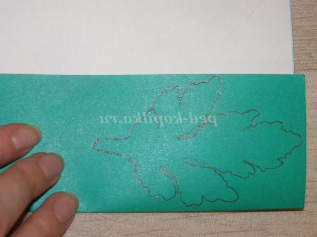 За шаблоном обводимо листочок по лицьовій стороні зеленого аркуша паперу, склавши аркуш вдвічі за розміром листочка. Поки не вирізаємо листочок.