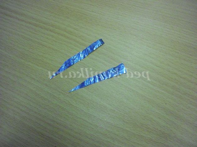 А ось бурульки ми вирізаємо з фантиків блакитних відтінків. Нарізаємо тонкі смужки, і наші бурульки готові!
