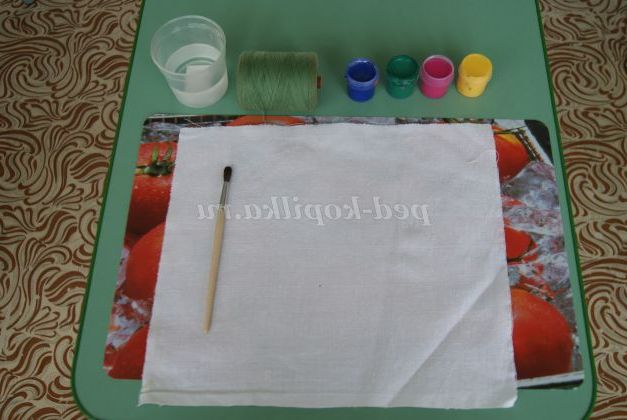Квадратний шматок білої тканини, краще підкладкової, але для перших занять можна використовувати будь-яку тонку білу тканину 30х30 см; гуаш, добре розведена водою або акварельні фарби; кисть № 5; стаканчик з водою; швейні нитки і серветка, що б накрити стіл.