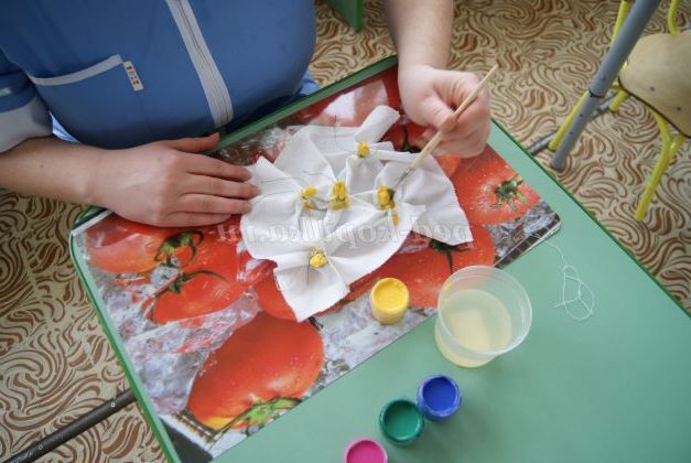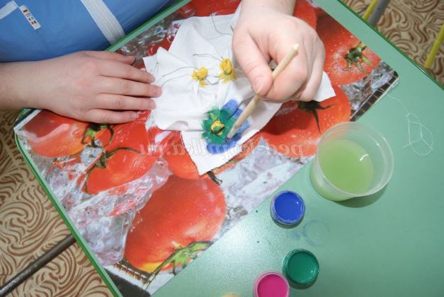 3. Починаємо розпис. Розфарбовуємо спочатку вузлик. Пензлик і тканина мочимо водою якомога більше, від цього залежить розтікання фарби і, як наслідок, краса закінченої роботи.