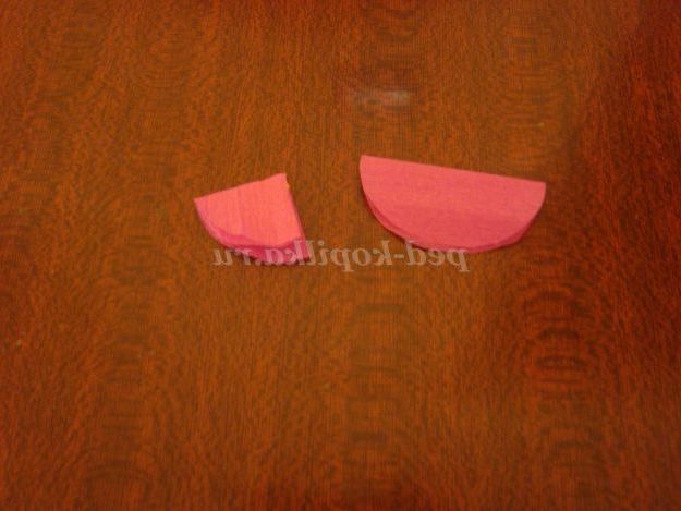 Складаємо їх навпіл по довжині і зрізаємо куточки так, щоб вийшли листочки. Приклеюємо листочки до стебелькам.