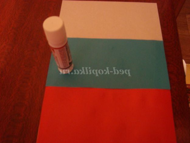 Беремо картон білого кольору. Кладемо його перед собою і на нього наклеюємо прямокутники синього і червоного кольору, зображуючи Російський прапор. Розміри прямокутників будуть залежати від розмірів вашого картону. Наші розміри 9,5 см*20см. Біла смуга залишається від картона.Основа готова.