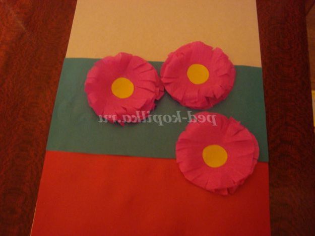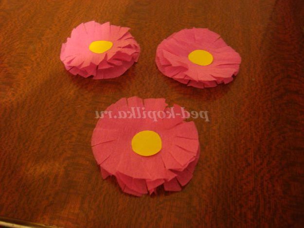 З паперу жовтого кольору вирізаємо серединку для цветочков.Три квіточки-три серединки. І приклеюємо їх у центр. Наші квіточки готові.