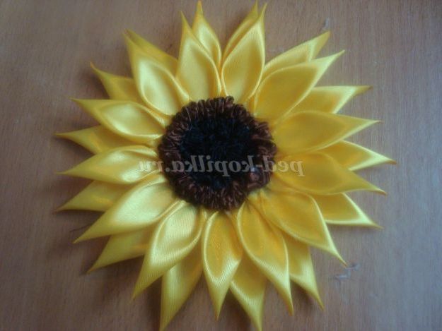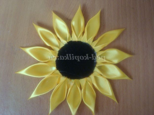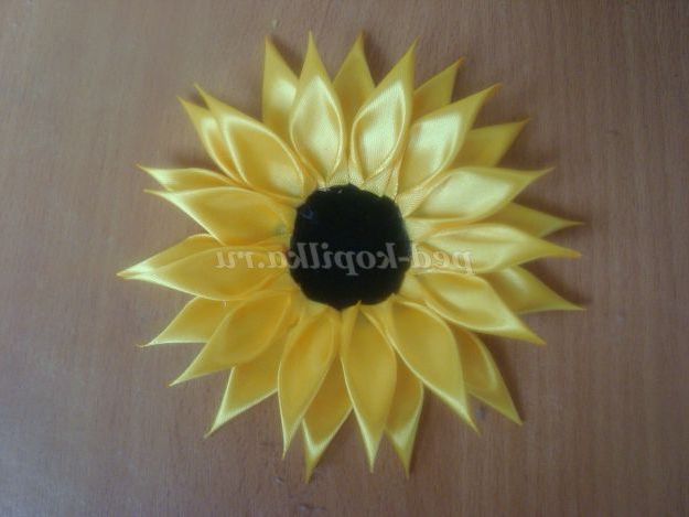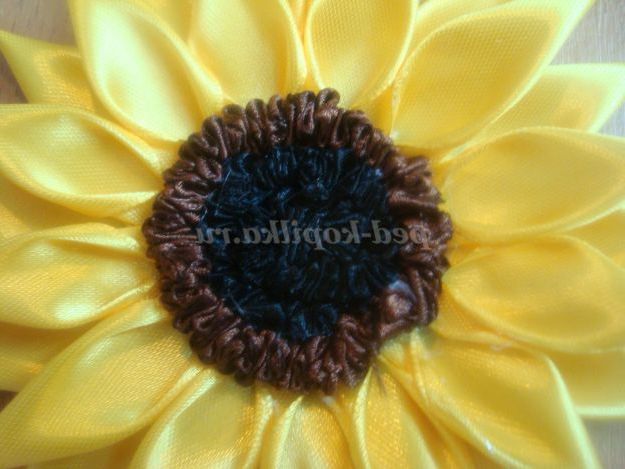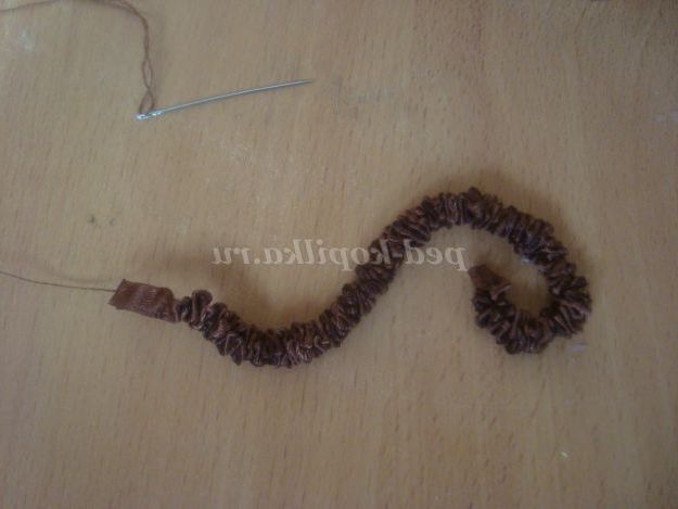 8. Займемося серединою нашого соняшника. З атласної стрічки коричневого кольору відрізаємо смужку довжиною 25 див. Складаємо його навпіл по довжині і за допомогою голки з ниткою збираємо її в "гармошку". Нитку закріплюємо і відрізаємо.