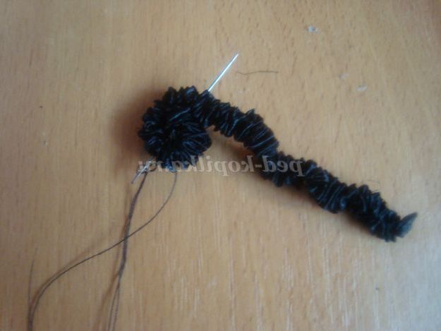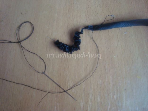 9. З атласної стрічки чорного кольору відміряємо смужку довжиною 35 см і збираємо її в "гармошку", але нитка не відриваємо, а робимо з "гармошки" коло для серединки. Закріплюємо це коло ниткою. Відрізаємо нитку.