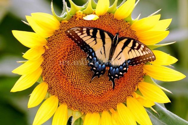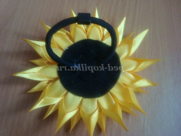 13. Займемося прикрасою соняшника. "Посадимо" на нього метелика. І приклеїмо клейовим пістолетом полубусины. Резиночка готова.