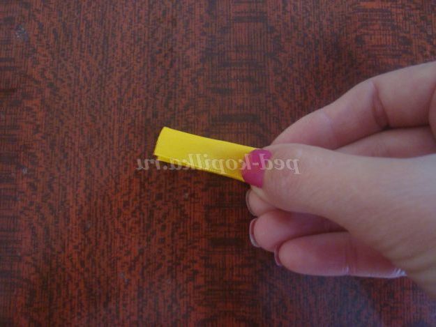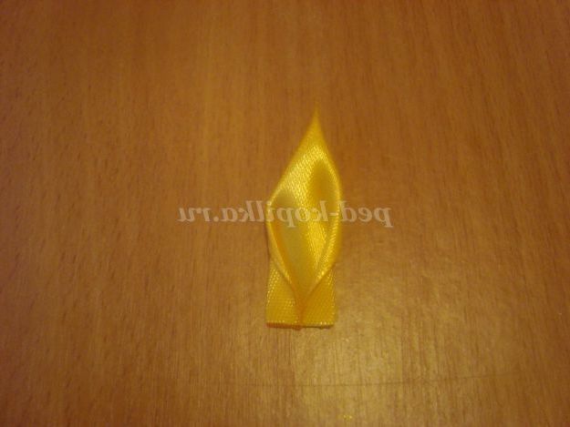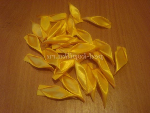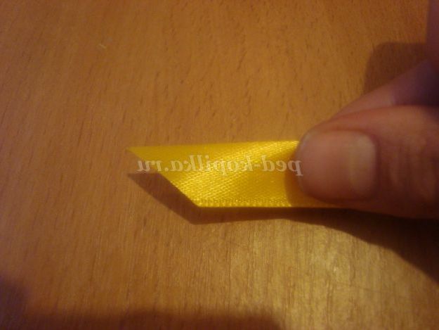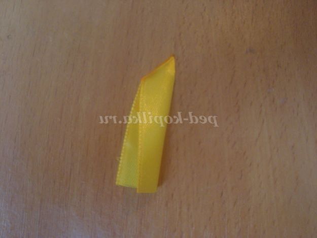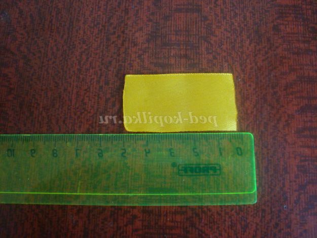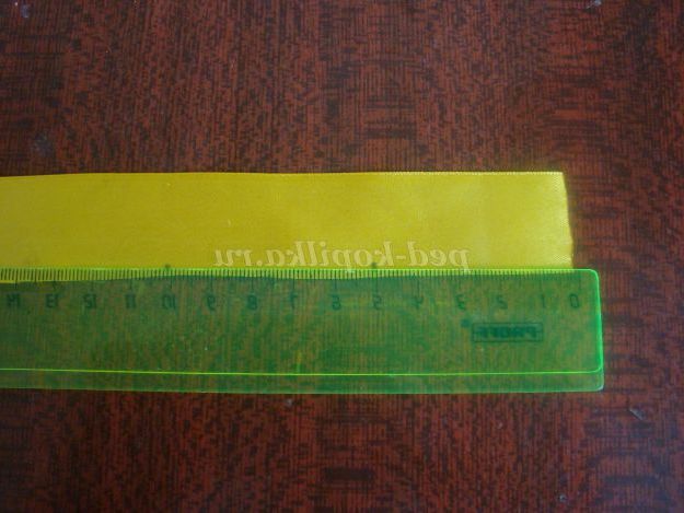 1. З атласної стрічки жовтого кольору робимо заготовки. Для цього за допомогою лінійки відзначаємо смужки довжиною 5 см і нарізаємо їх.
