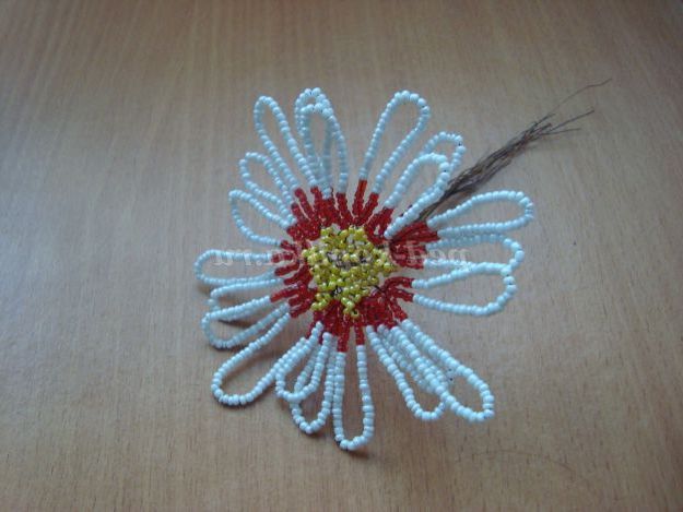 18) Ще я зробила дві ромашки для букета, але вони не чисто білі. У одній додано червоний бісер (6 штук) знизу кожної петельки, а в інший прозорий жовтий( 6 штук)