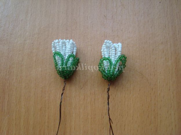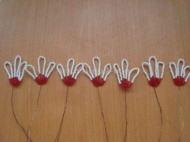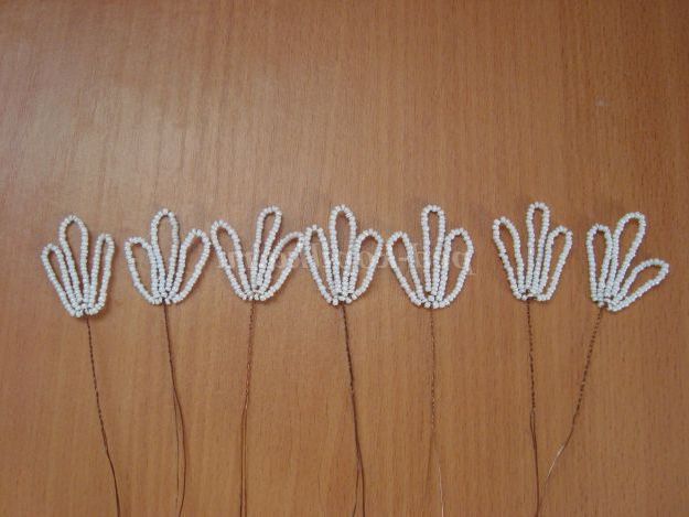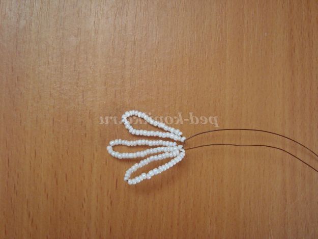 14) Займемося бутонами. Для цього набираємо на дріт білий бісер довжиною 5 см і робимо петельку.Таких петельок робимо 6 штук