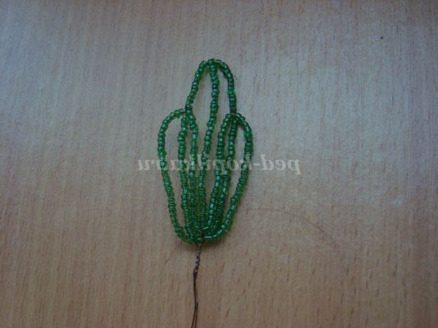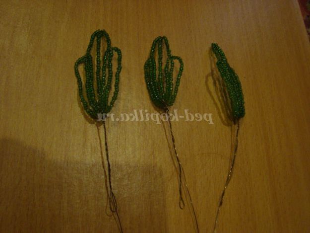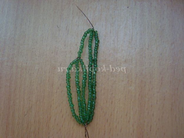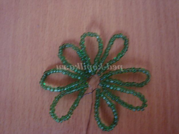 7) Для чашолистка набираємо на дріт зелений бісер довжиною 6 див. Робочим кінцем дроту входимо назад в першу бісеринку, виходить петелька, таких петельок робимо 8 .