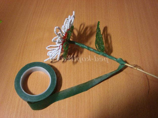 27) Збираємо наші ромашки. Беремо білу ромашку і обмотуємо її флористичної стрічкою. По ходу додаючи бутон і листочок.