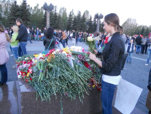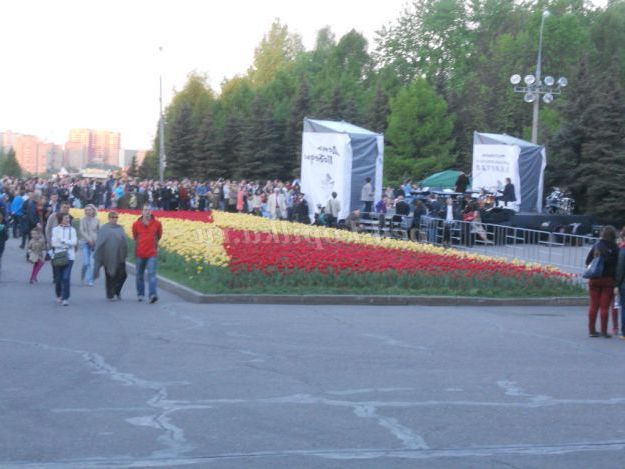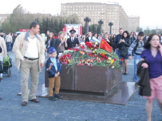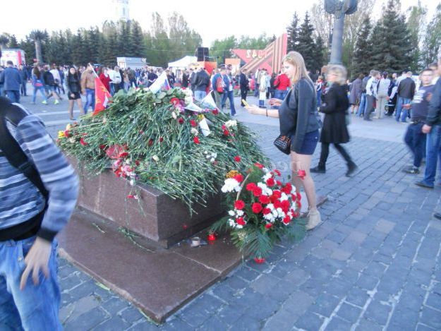Багато червоних тюльпанів біля пам'ятника,як червоні річки