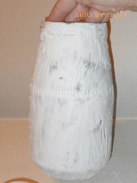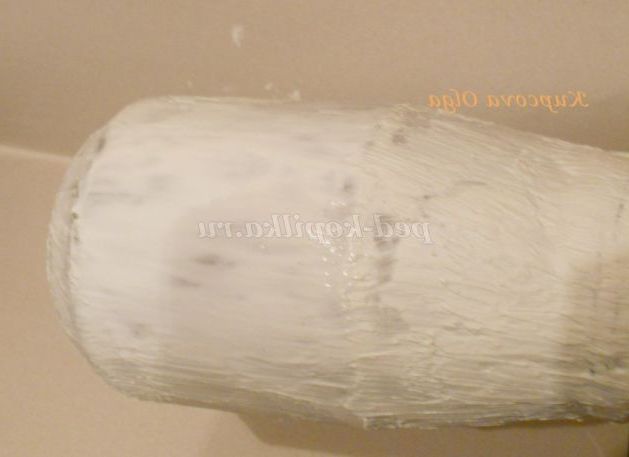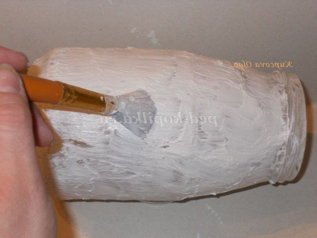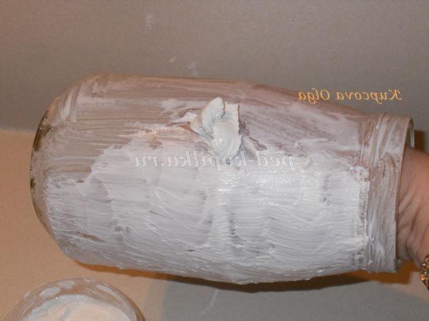 Наступне наше дію з імітувати шкуру, її шорсткості і напрямок дрібних волосков.Для цього накладаємо на банку купку шпаклівки і жорсткої пензлем робимо мазки за напрямом вниз.Должны з'явитися дрібні подряпини .