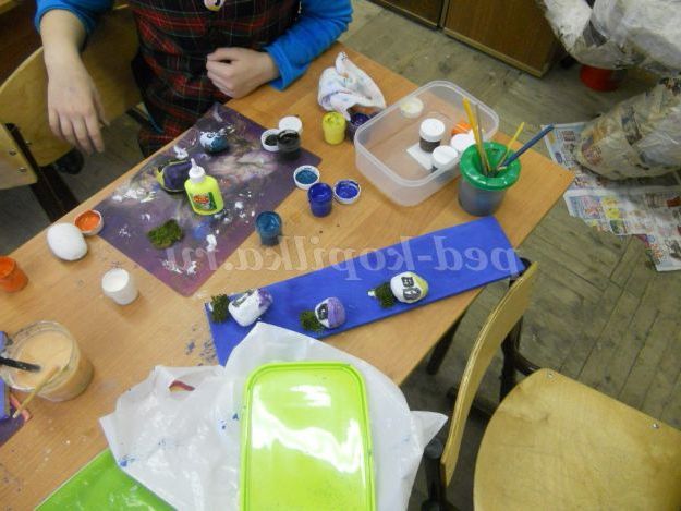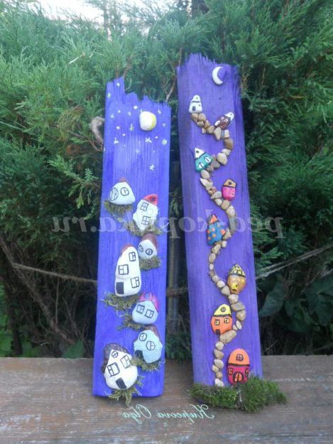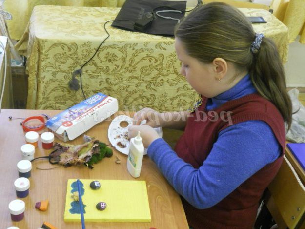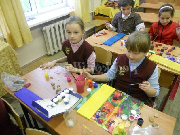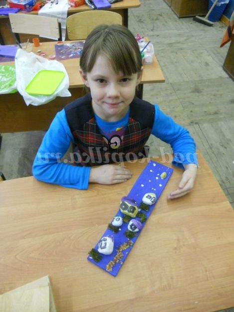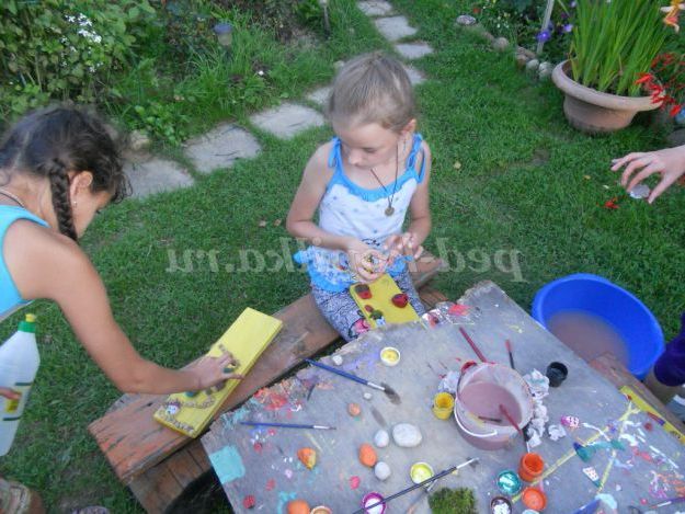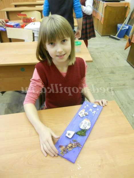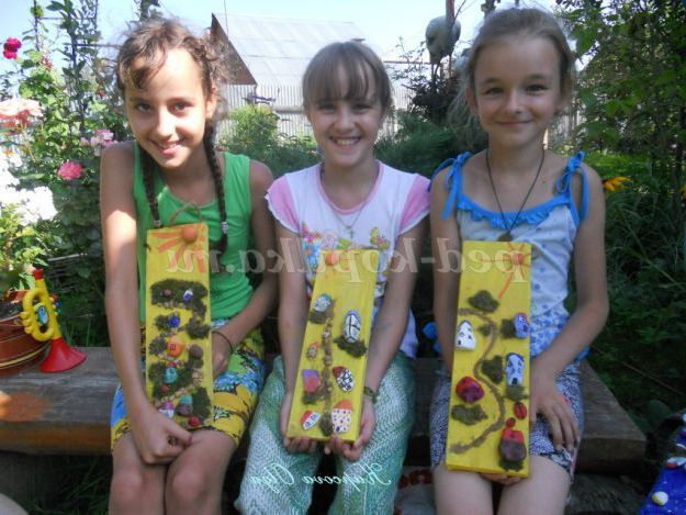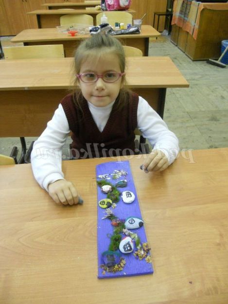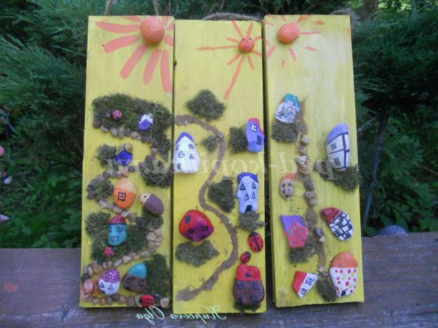 Відразу обмовлюся,ідея не моя,але вона на стільки цікава,що не повторити її я не змогла. А почалося у нас всі на дачі. У нас троє дітей(Люба - 9 років(моя)Таня - 10 років і Юля - 11 років (племінниці)) ми розважалися, як могла і чим могли. На сайті "Країна майстрів" є чудовий МК. Ось його я і намагалася згадати,а дівчата підтримували. І так, на будь-яку поверхню, у нас була досочка,наносимо фон,можна зробити нічний - синій або фіолетовий,денний - жовтий. Поки наш фон сохне приступаємо до фарбування камінців,перетворюємо їх в будиночки .всі як годиться з дахом, трубою і віконцями. Поки ми возилися з будиночками фон висох і перший камінчик приклеюємо за допомогою клею "Титан" і так далі,ніж камінчик - будиночок дрібніше, тим вище на досочке він розташовується.