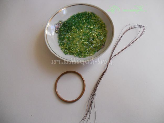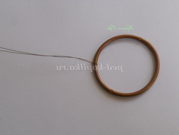 А ось тепер набираємо на цю ж дротик кілька бісеринок і обмотуємо кільце так,щоб приховати кінець обмотки від коренів.