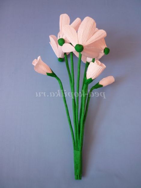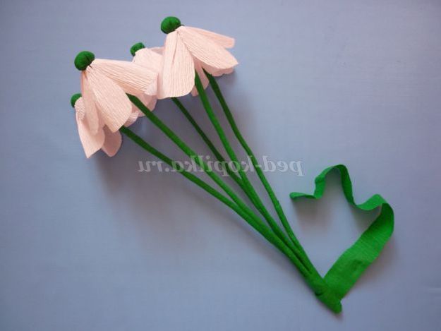 До квіткам приєднуємо великі бутони, закріплюємо внизу папером. Згинаємо стеблинки квіток і бутонів, щоб квіти та бутони дивилися вниз.