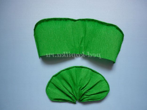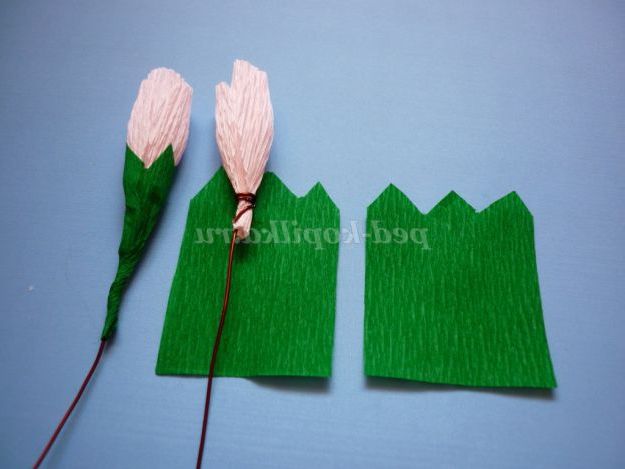 По шаблону з зеленого паперу вирізаємо заготовку, кладемо на середину бутон і обертаємо його, скручуючи папір навколо дроту.