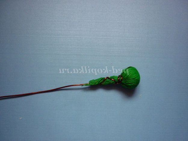 По шаблону з зеленого паперу вирізаємо заготовку, кладемо на середину бутон і обертаємо його, скручуючи папір навколо дроту. Смужкою паперу шириною 2см обмотуємо дріт.