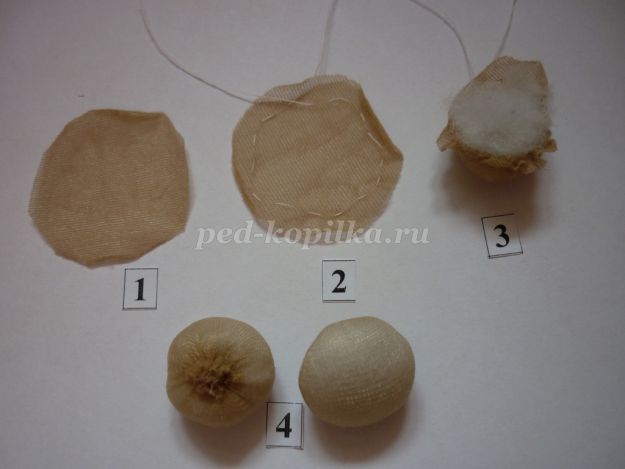 Робимо носик. Виріжте невеликий гурток з капрону, зробіть по колу сходинку, стягаючи, наповнюйте синтепоном. Сформуйте носик, добре закріпіть нитку.